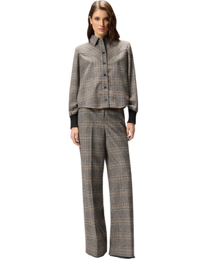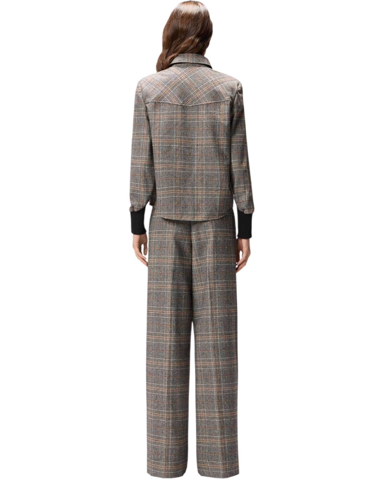 Μακρυμάνικο πουκάμισο με βάτες στους ώμους, κλασικό γιακά και μπροστινό κούμπωμα. Το πουκάμισο, κατασκευασμένο από σύμμεικτο μάλλινο ύφασμα από βαμμένα νήματα, έχει καρό μοτίβο σε στυλ πρενς ντε γκαλ, με μια πρωτότυπη πινελιά που εκφράζεται από τις πλεκτές μανσέτες με λεπτή πλέξη λάστιχο που δημιουργεί μια ενδιαφέρουσα αντίθεση χρώματος και υφάσματος. Δώστε μια διαφορετική πινελιά στα looks σας για το γραφείο με αυτή την καινοτόμο επανέκδοση στο απόλυτο στυλ της PINKO.