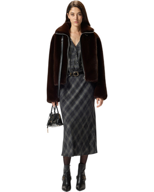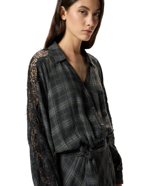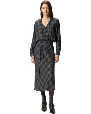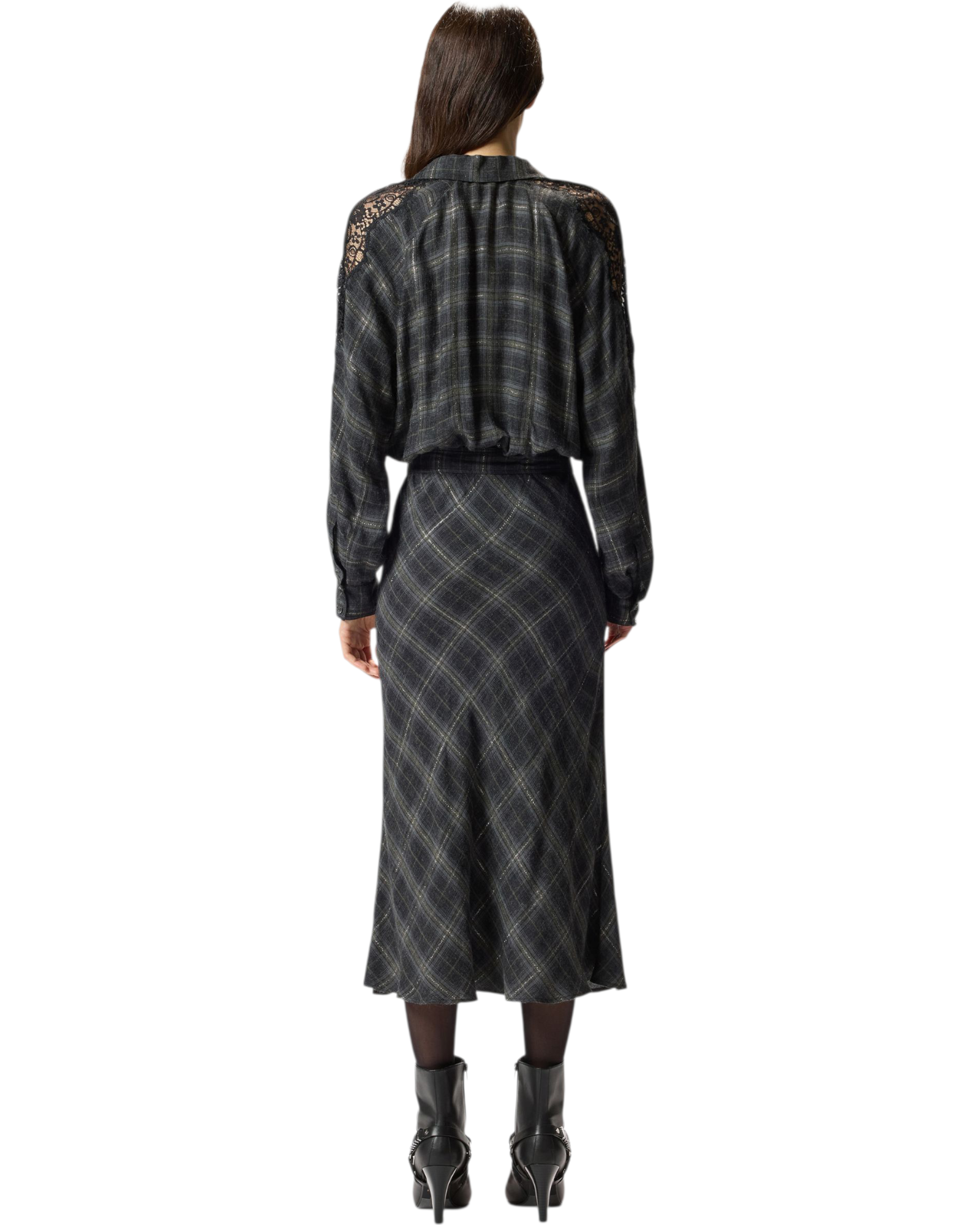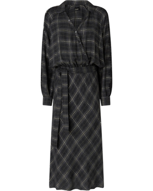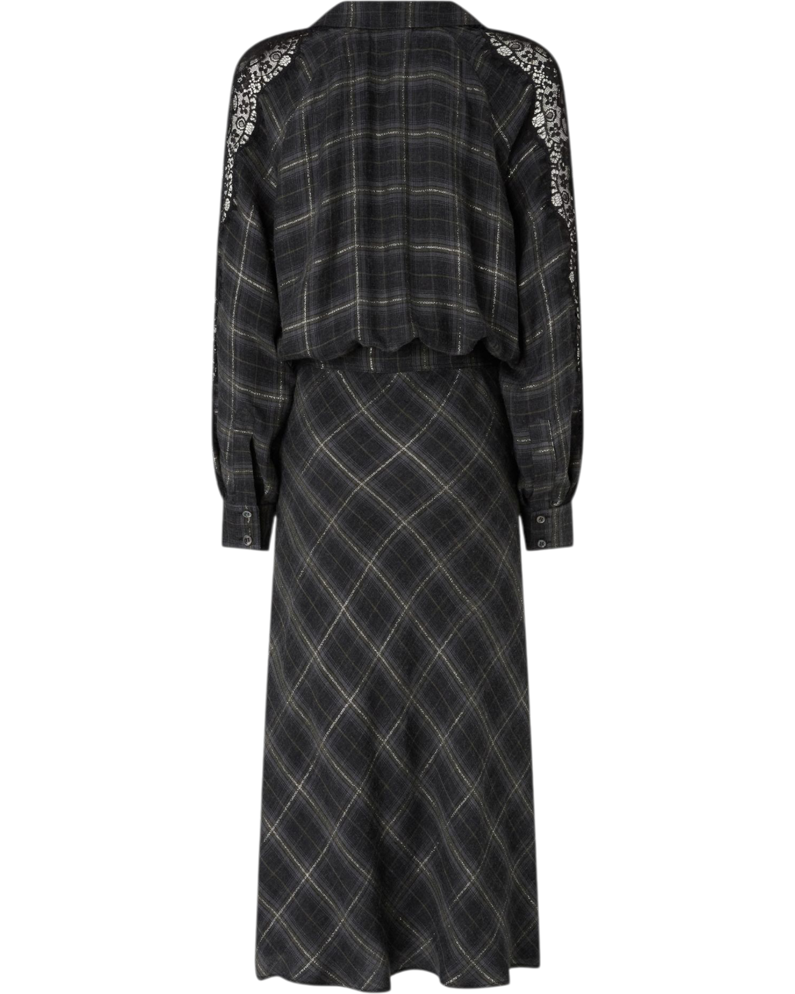 Μακρύ φόρεμα με μακριά μανίκια και χαλαρή εφαρμογή, κατασκευασμένο από ζεστό και απαλό ύφασμα που προσαρμόζεται στο σώμα, με γιακά σε στυλ πουκάμισου που ανοίγει σε V λαιμόκοψη με σταυρωτά κουμπιά. Το φόρεμα με ασορτί ζώνη, έχει καρό μοτίβο με μεταλλική κλωστή και εκλεπτυσμένα τμήματα από κυματιστή δαντέλα στα μανίκια, σε στυλ lingerie. Δώστε τη σωστή σημασία στις στιγμές σας εκτός εργασίας με αυτό το χυτό και ευέλικτο ρούχο.