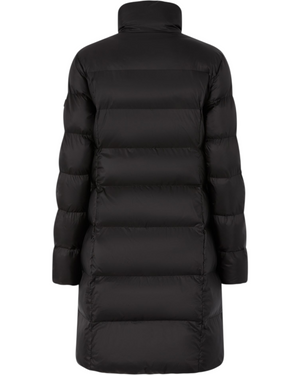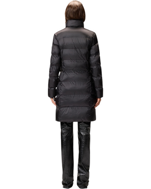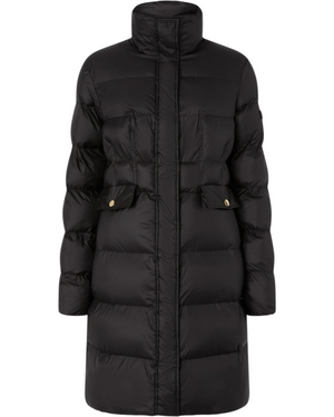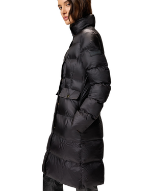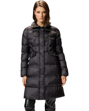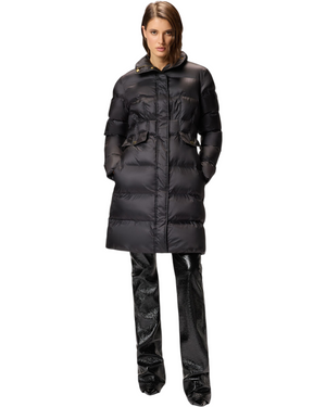 Μακρύ μπουφάν με επένδυση από πούπουλα και οριζόντια καπιτονέ υφή, κατασκευασμένο από τεχνικό καμβά με εντυπωσιακό ημι-γυαλιστερό εφέ. Αυτό το ρούχο διαθέτει ψηλό λαιμό που αγκαλιάζει το σώμα, κρυφό μπροστινό κούμπωμα και πρακτικές πλαϊνές τσέπες με καπάκι και κουμπώματα. Ένα κομμάτι πανωφόρου που συνδυάζει λειτουργικότητα και στυλ, αυτό το μπουφάν με πούπουλα είναι ιδανικό για καθημερινές εμφανίσεις, ακόμα και όταν αρχίζει να κάνει κρύο.