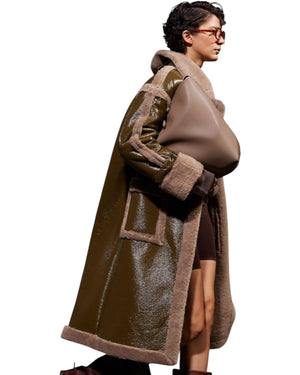 Αυτό το γυναικείο παλτό σε λαδί και μπεζ αποχρώσεις αναδεικνύει την κομψότητα και την άνεση. Έχει σχεδιαστεί για να προσφέρει ζεστασιά και στυλ τις κρύες μέρες, καθιστώντας το ιδανικό για κάθε ντύσιμο.