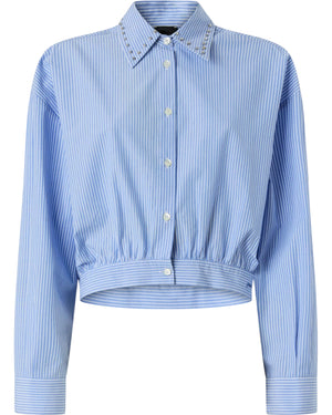 Κοντό πουκάμισο από βαμβακερή ποπλίνα βαμμένη με νήμα, με κλασικό γιακά, μακριά μανίκια με κουμπωτές μανσέτες, πατιλέτα με κουμπιά μπροστά και στρίφωμα με σούρες, με το κεντημένο λογότυπο PINKO με καλλιγραφικά γράμματα. Το στυλ ξεχωρίζει για το χαρακτηριστικό μοτίβο με λευκές και μπλε κάθετες ρίγες και τα εναλλασσόμενα μικρά μεταλλικά στοιχεία σε σχήμα κύβου και τα χειροποίητα κεντημένα κρύσταλλα σε όλο το άκρο του γιακά. Συνδυάζοντας την ευελιξία του σχεδίου με την πολυτέλεια της διακόσμησης, αυτό το κομμάτι θα γίνει ο άσσος σας για να δημιουργείτε συνεχώς μεταβαλλόμενες εμφανίσεις, τόσο σε στυλ όσο και σε περίσταση.