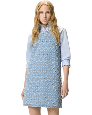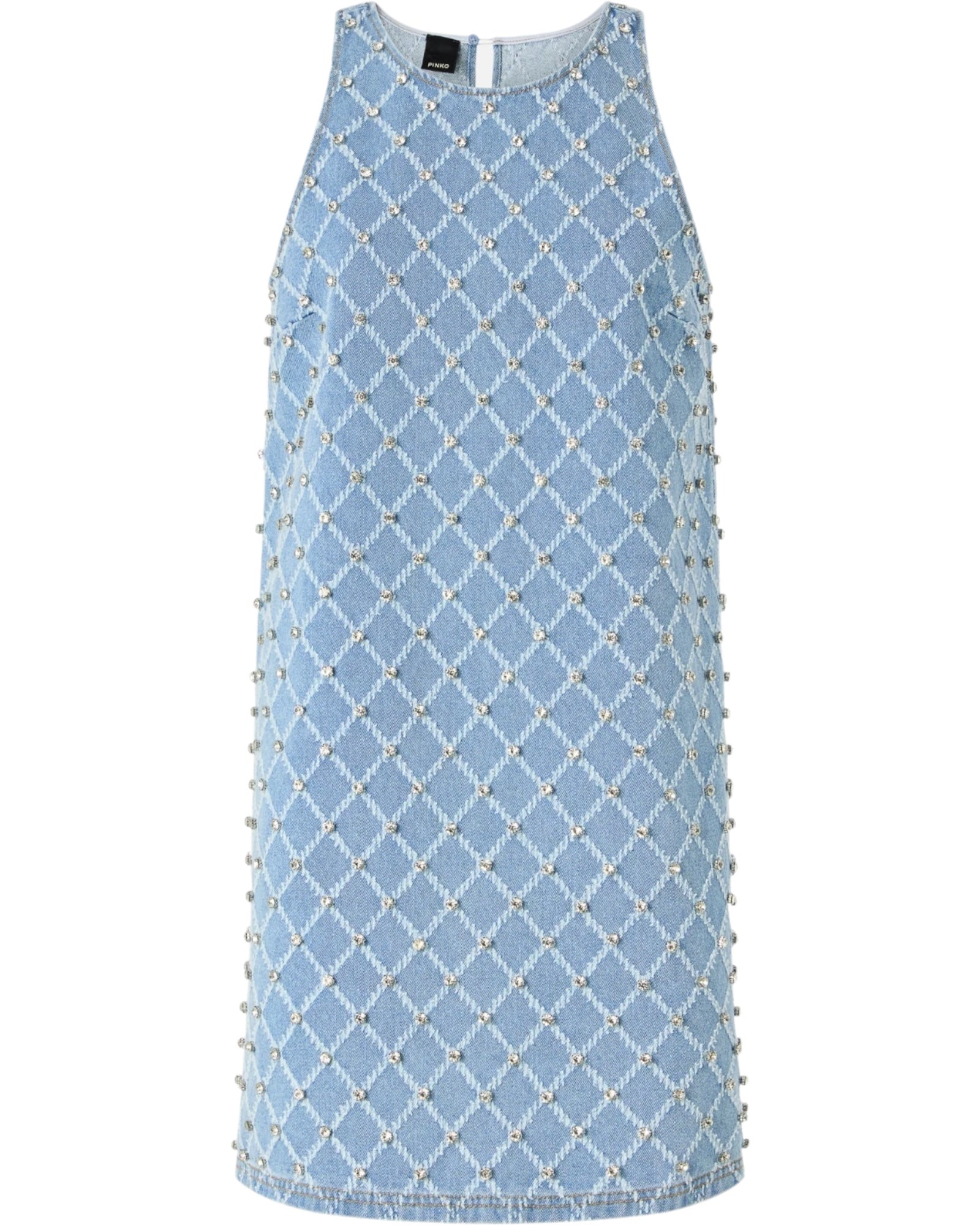 Κοντό αμάνικο φόρεμα με στρογγυλή λαιμόκοψη και άνοιγμα στην πλάτη και ίσια σιλουέτα που θυμίζει φορέματα της δεκαετίας του 1960. Αυτό το στυλ αναδεικνύει ένα σύγχρονο παιχνίδι με τις αντιθέσεις, όπως μόνο η PINKO μπορεί να κάνει: το μινιμαλιστικό σχέδιο συνδυάζεται με τζιν κομμένο με λέιζερ με ένα ελαφρώς αντίθετο μοτίβο διαμαντιών, διακοσμημένο με εκθαμβωτικά κεντημένα στο χέρι στρας. Φορέστε αυτό το κομμάτι σε ένα καλοκαιρινό πάρτι και ετοιμαστείτε να λάμψετε!