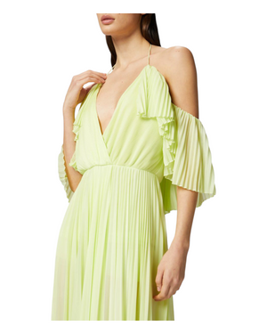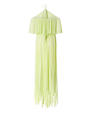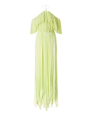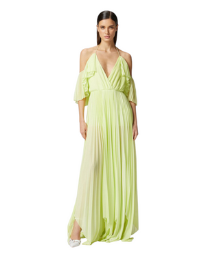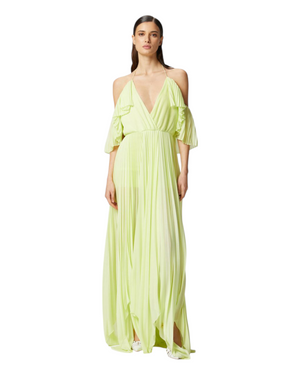 Κομψό επίσημο φόρεμα με βαθύ ντεκολτέ σε σχήμα V, δέσιμο στην πλάτη και θηλυκό σχέδιο που αφήνει την πλάτη και τους ώμους ακάλυπτους. Ένα ένθετο με βολάν δίνει στο μπούστο μια ξεχωριστή πινελιά και καλύπτει μέρος των χεριών, προσθέτοντας μια εκλεπτυσμένη και κομψή λεπτομέρεια. Η μακριά φούστα ολοκληρώνεται με ένα ακανόνιστο στρίφωμα σε σχήμα μαντηλιού, το οποίο δημιουργεί ένα εφέ ουράς και τονίζει το μήκος αυτού του φορέματος, το οποίο χάρη στην ελαφρότητά του και τις λεπτομέρειες που το χαρακτηρίζουν είναι ιδανικό για ανοιξιάτικους γάμους και τελετές. Φόρεσε το μακρύ πλισέ φόρεμα με ένα ζευγάρι κομψά μυτερά παπούτσια για να είσαι η τέλεια καλεσμένη σε κάθε περίσταση.