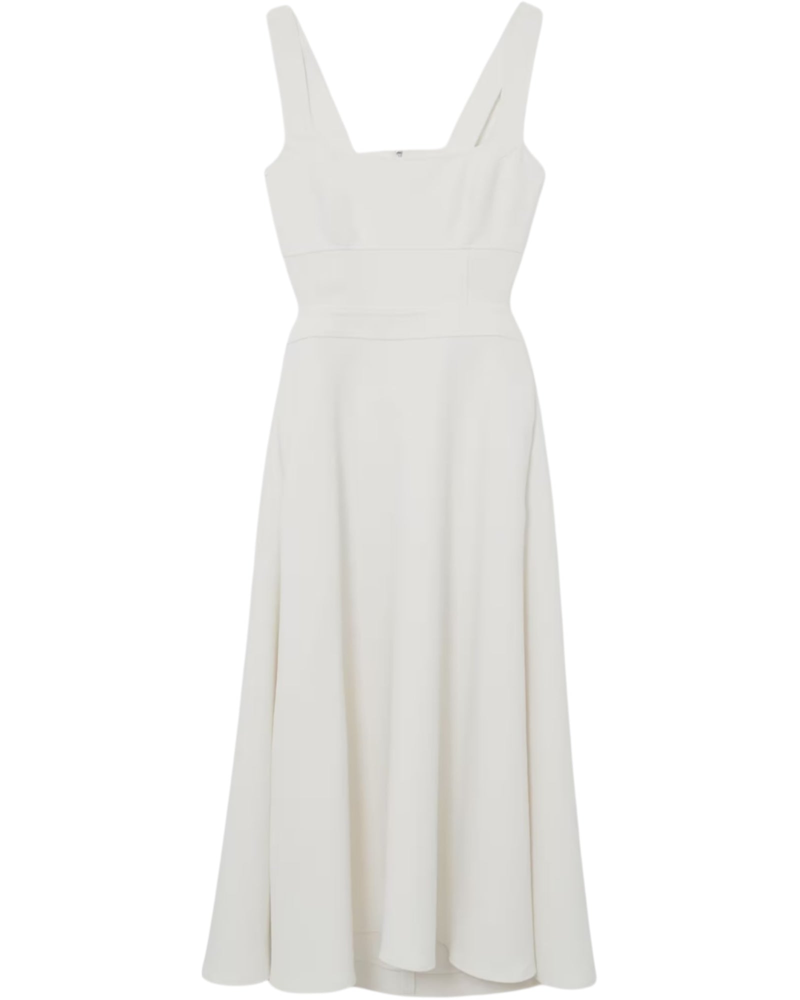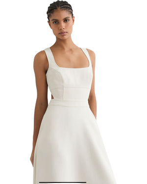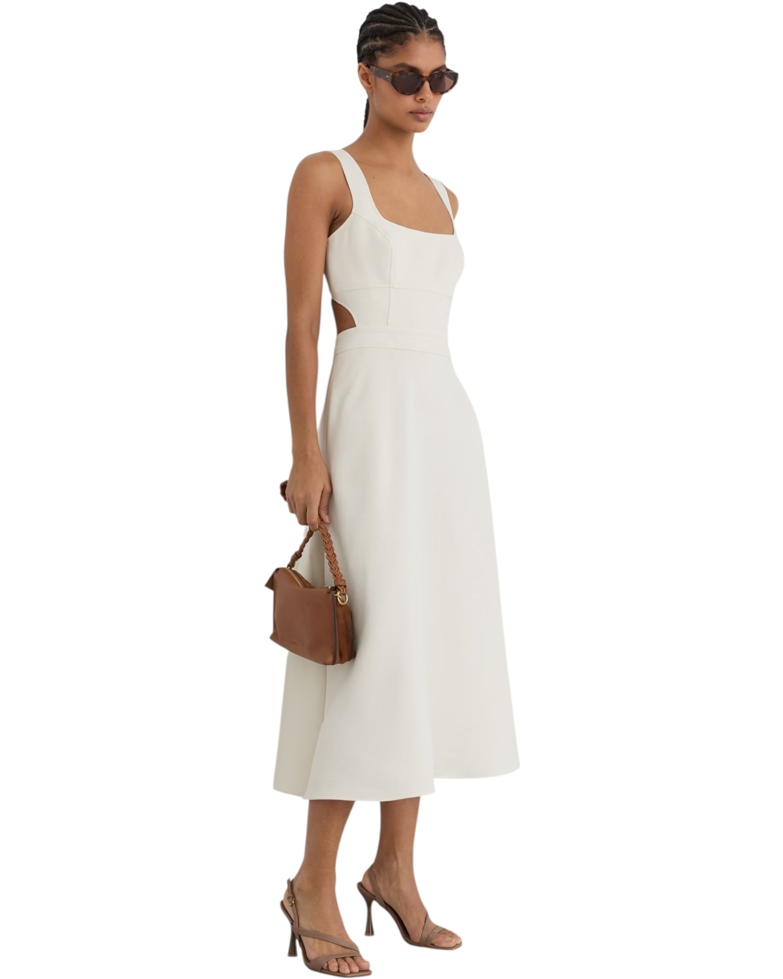 Το μίντι φόρεμα Ivory Dina είναι κατασκευασμένο από twill με εφαρμοστό μπούστο και απαλή φαρδιά φούστα, δημιουργώντας μια σιλουέτα με μέση. Ένα άνοιγμα στην πλάτη προσθέτει μια μοντέρνα πινελιά.