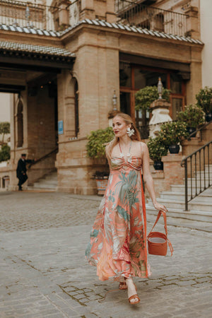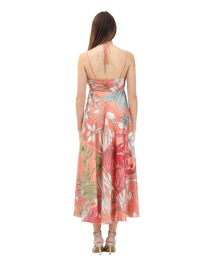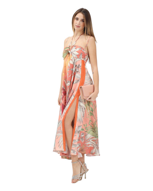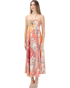 Γυναικείο μακρύ πολύχρωμο φόρεμα από τη συλλογή Simona Corsellini με τροπικό τύπωμα, ιδανικό για μια εκλεπτυσμένη καλοκαιρινή εμφάνιση. Διαθέτει ανάλαφρο και ρευστό σχέδιο, με λεπτές τιράντες και ρυθμιζόμενο ντεκολτέ εμπλουτισμένο με λεπτομέρειες από κοσμήματα. Το εφαρμοστό στήθος αναδεικνύει τη σιλουέτα, ενώ η φαρδιά και κυματιστή φούστα προσδίδει κίνηση και κομψότητα. Το κλείσιμο στην πλάτη με κορδόνια επιτρέπει την ρυθμιζόμενη εφαρμογή. Ιδανικό για ειδικές περιστάσεις ή εκδηλώσεις σε εξωτερικούς χώρους, αυτό το φόρεμα συνδυάζει στυλ και φρεσκάδα σε μια ενιαία δημιουργία.