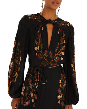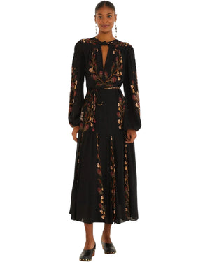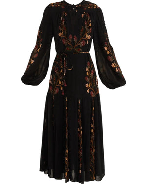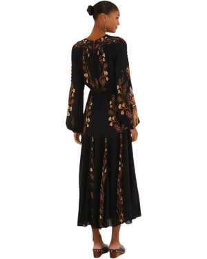 Το φόρεμα Black Berry Garden με μακριά μανίκια και πλισέ μάξι φόρεμα σας τυλίγει σε μια χαριτωμένη σιλουέτα, με την αέρινη πλισέ φούστα και το λεπτό ντεκολτέ V που προσκαλεί σε μια ήσυχη αυτοπεποίθηση. Διακοσμημένο με μαγευτικά φλοράλ μοτίβα σε ζεστά κόκκινα και γήινα πράσινα, αυτό το μαύρο φόρεμα αφηγείται μια ιστορία για τη γοητεία της φύσης. Τα διαφανή, φουσκωτά μανίκια προσθέτουν μια ψιθυριστή κομψότητα, αιχμαλωτίζοντας τόσο την απαλότητα όσο και το διακριτικό δράμα για κάθε απαλό αεράκι.