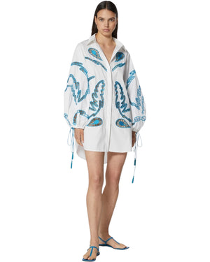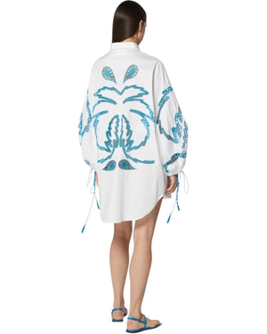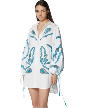 Ένα ρούχο σε στυλ Boho-Chic που συνδυάζει τη φρεσκάδα του βαμβακιού με λεπτομέρειες κεντημένες με εκλεπτυσμένο σχέδιο. Τα μεγάλα μανίκια με ρυθμιζόμενα κορδόνια και κομμένα κεντήματα δημιουργούν ένα ανάλαφρο και δυναμικό αποτέλεσμα.