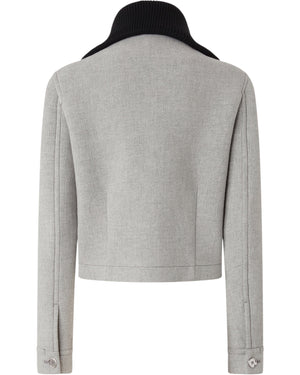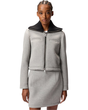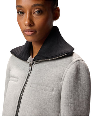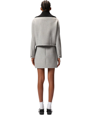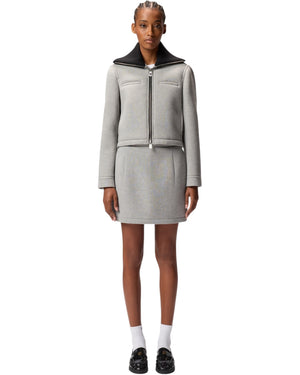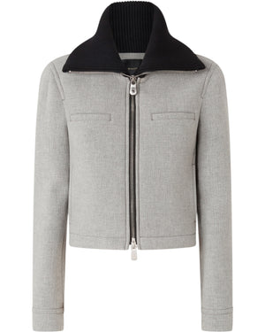Εφαρμοστή ζακέτα με κλείσιμο με φερμουάρ σε ολόκληρο το μήκος με διπλό οδηγό και τσεπάκια στο στήθος, κατασκευασμένη από πλυμένη μάλλινη γάζα σε στρώσεις. Το ύφασμα προσδίδει μια συμπαγή και μοντέρνα όψη στο ρούχο, ενώ το σχέδιο είναι δομημένο, ιδανικό για καθημερινά looks. Το κύριο χαρακτηριστικό του μοντέλου όμως είναι ο ψηλός γιακάς που διακόπτει τη μονοχρωμία του σχεδίου με μια πλέξη ριμπ σε χρωματική αντίθεση.