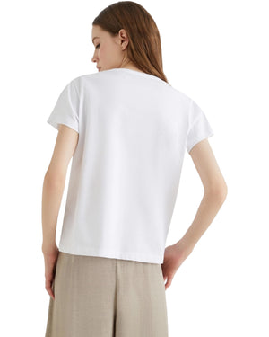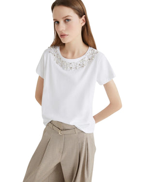Το βαμβακερό ζέρσεϊ μπλουζάκι είναι πάντα νικητής. Ειδικά όταν η λαιμόκοψη είναι διακοσμημένη με κεντημένη γυάλινη πέρλα και κρυστάλλινη λεπτομέρεια από καμποσόν.