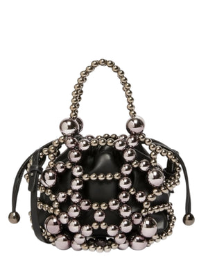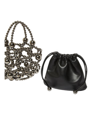 • Μικρή τσάντα-κουβά με φαρδιούς κρίκους και λεπτομέρεια σε σχήμα σφαίρας δύο μεγεθών.