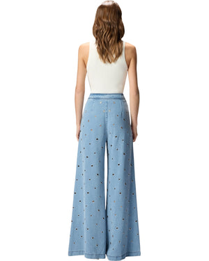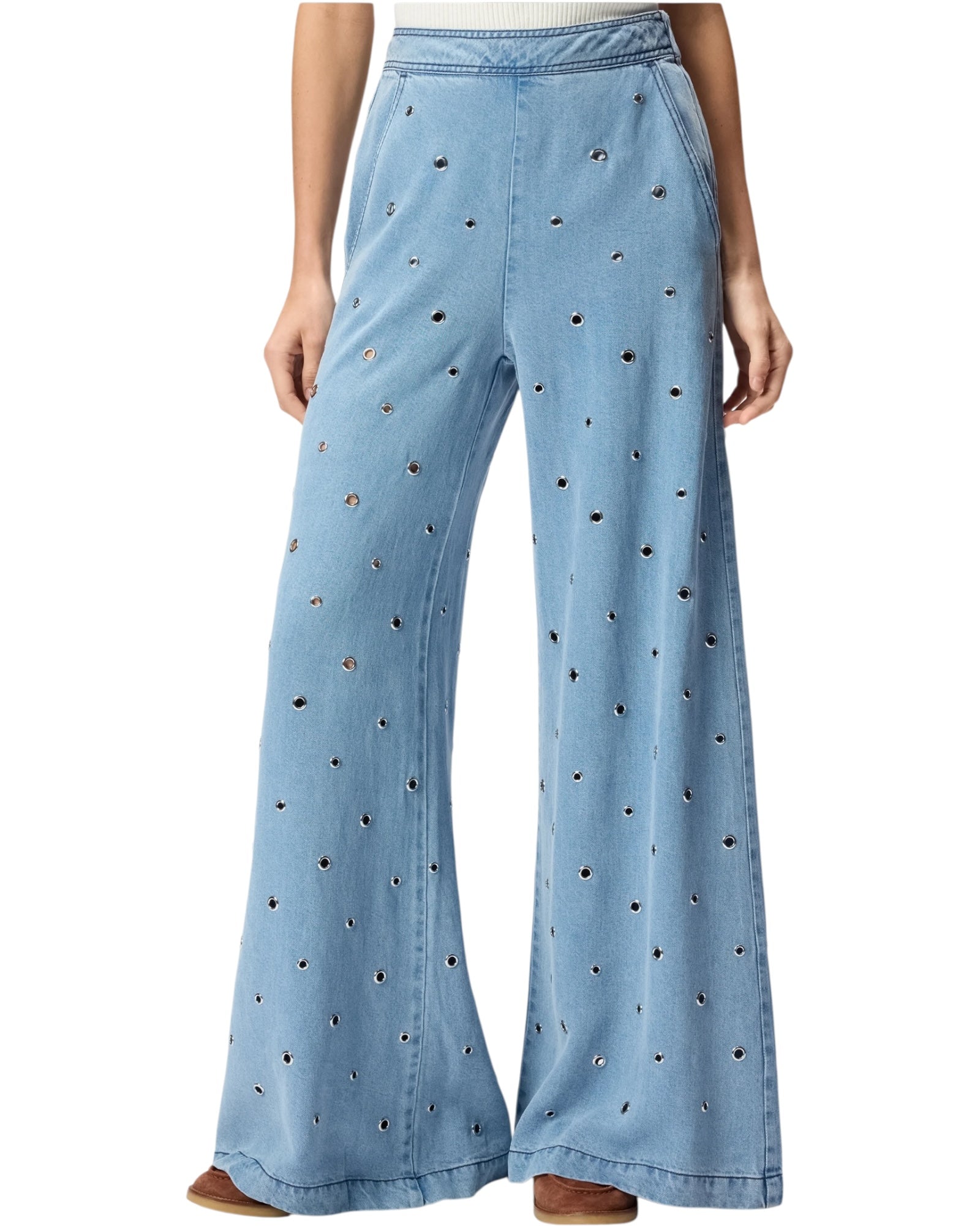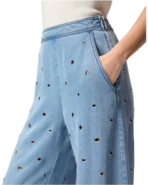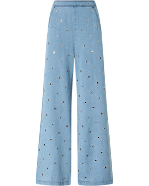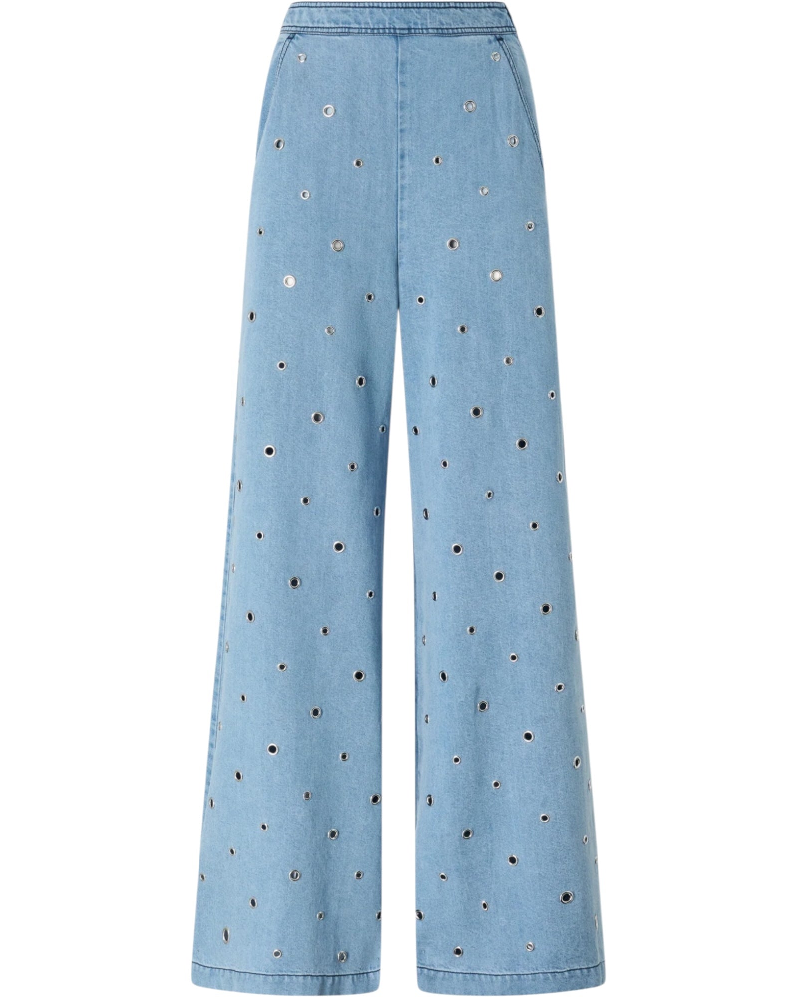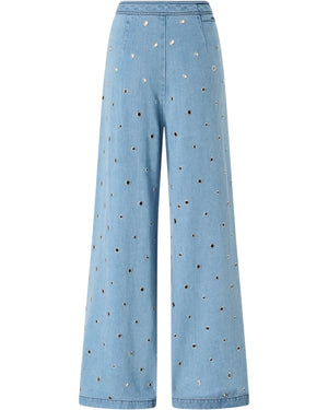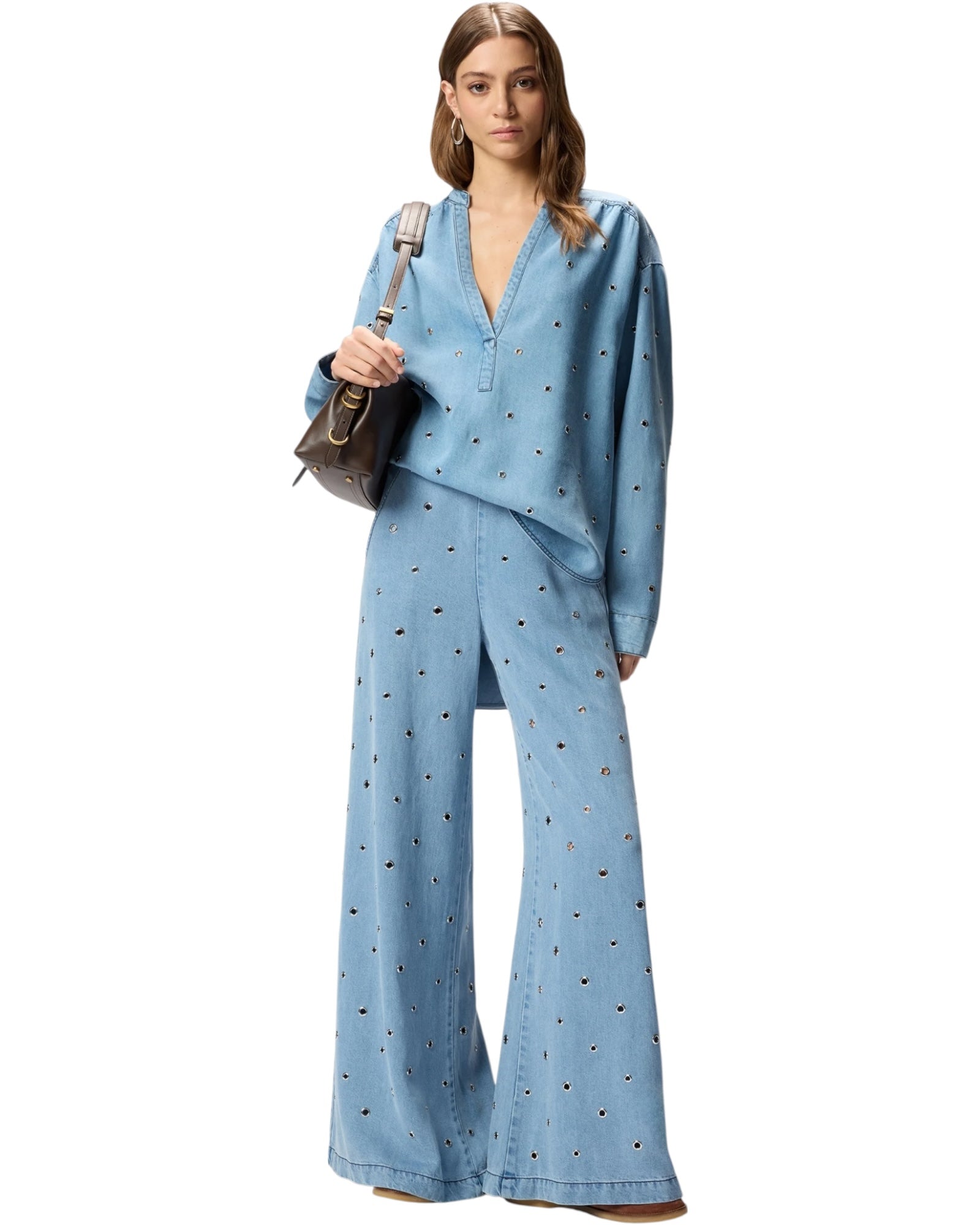 Φαρδύ παντελόνι με λοξές πλαϊνές τσέπες και πλαϊνό φερμουάρ. Αυτό το στυλ ξεχωρίζει για τη μοναδική του κατασκευή: το ελαφρύ, ρέον ύφασμα denim από καθαρό lyocell έχει μια επιδέξια ξεβαμμένη εμφάνιση και είναι διακοσμημένο εξ ολοκλήρου με μικρές μεταλλικές τρύπες που δημιουργούν ένα διακριτικό διάτρητο εφέ. Κάντε την καθημερινή σας εμφάνιση πρωτότυπη και εντυπωσιακή συνδυάζοντας αυτό το τζιν με την ασορτί μπλούζα.