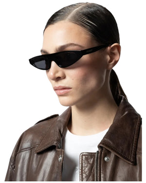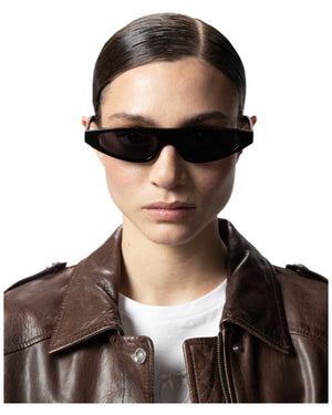 Γυαλιά ηλίου με σύγχρονο σχεδιασμό, μακρόστενα και ελαφρώς μυτερά, κατασκευασμένα από ασετάτ κυτταρίνης, με πλευρικούς βραχίονες διακοσμημένους με το λογότυπο PINKO. Η παραγωγή της capsule συλλογής είναι εξ ολοκλήρου Made in Italy, από τη μελέτη του μοντέλου, μέχρι τον σχεδιασμό και την παραγωγή του τελικού προϊόντος. Ακόμη και τα μικρά μέρη, όπως οι σερνιέρες του σκελετού, το εσωτερικό μέταλλο των βραχιόνων και οι βίδες, αγοράζονται όλα από ιταλικές εταιρείες