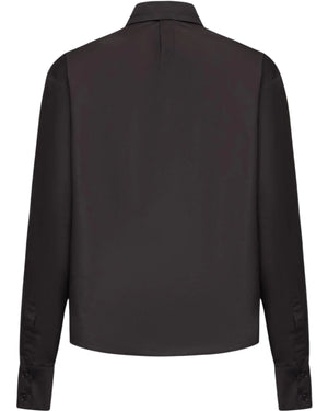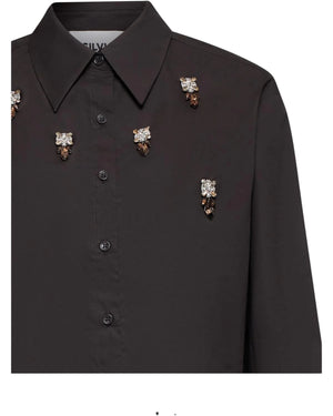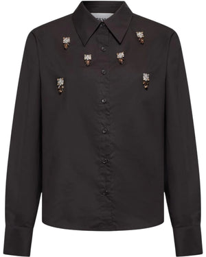 Ένα μαύρο πουκάμισο με απλικέ μικροκοσμήματα στο γιακά. Ιδανικό για συνδυασμό με σακάκι ή παντελόνι για μια πινελιά λάμψης.