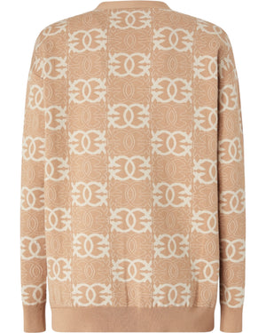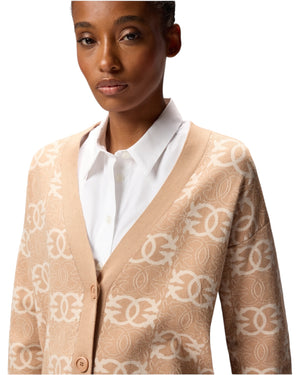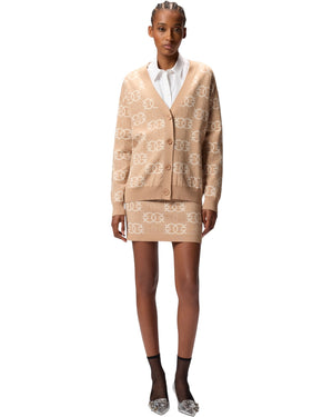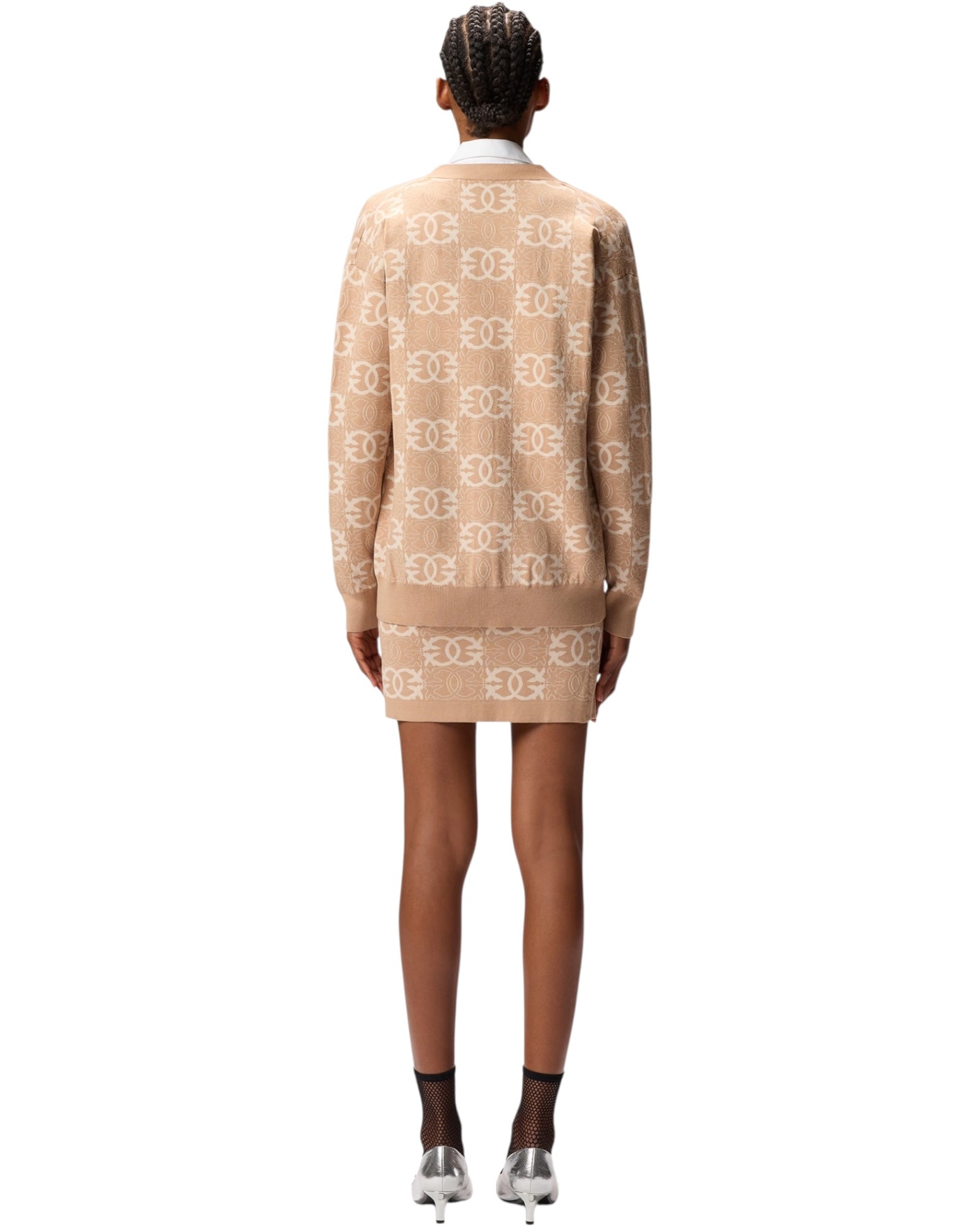 Υπερμεγέθης, μακρυμάνικη πλεκτή ζακέτα με κουμπιά στο ίδιο χρώμα και ριμπ ντεκολτέ V, πατιλέτα και μανσέτες σε αντίθεση. Το ζακάρ μοτίβο με το λογότυπο Love Birds σε όλη την επιφάνεια είναι μια εντυπωσιακή λεπτομέρεια που αναδεικνύει το μοντέλο. Το κομμάτι έχει υποβληθεί σε δοκιμές φινιρίσματος για την ελαχιστοποίηση του πιθανού σχηματισμού φουσκώματος, εξασφαλίζοντας μεγαλύτερη απαλότητα και ανθεκτικότητα του υφάσματος. Συνδυάστε αυτό το εκλεπτυσμένο, ευέλικτο κομμάτι με την ασορτί φούστα του από την ίδια συλλογή για μια σίγουρη εμφάνιση.