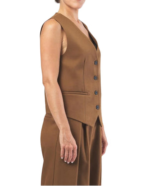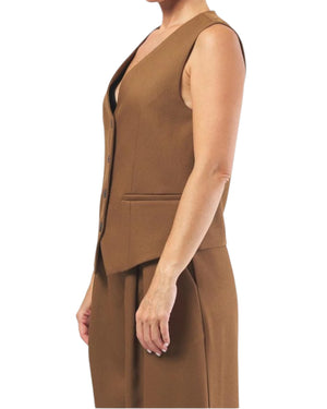 Ανανεώστε την γκαρνταρόμπα σας με αυτό το κομψό καφέ γιλέκο σε tailored γραμμή. Διαθέτει V λαιμόκοψη, διακοσμητικές τσέπες και κουμπιά μπροστά, προσφέροντας ένα διαχρονικό στυλ που μπορεί να φορεθεί τόσο μόνο του όσο και πάνω από πουκάμισο ή μπλούζα. Το ύφασμα είναι σταθερό με απαλή υφή, κατάλληλο για όλες τις εποχές.
