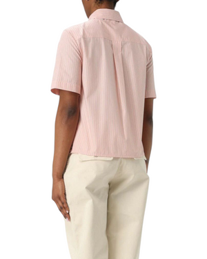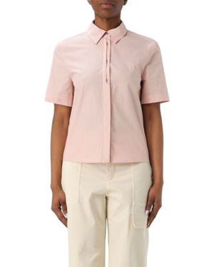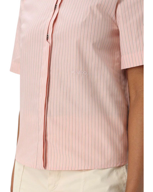 Γυναικείο πουκάμισο από ύφασμα ποπλίνας από καθαρό βαμβάκι με δίχρωμο μοτίβο με κάθετες ρίγες. Αυτό το κοντομάνικο πουκάμισο είναι το τέλειο ένδυμα για να συνδυαστεί με ένα ανοιξιάτικο παντελόνι, για να δώσει στις ημερήσιες εμφανίσεις σας για το γραφείο και τον ελεύθερο χρόνο σας μια ξεχωριστή, πρωτότυπη πινελιά. Ο μυτερός γιακάς συνοδεύεται από μια σειρά από μικρά μεταλλικά κουμπιά.