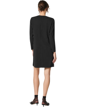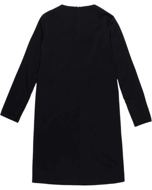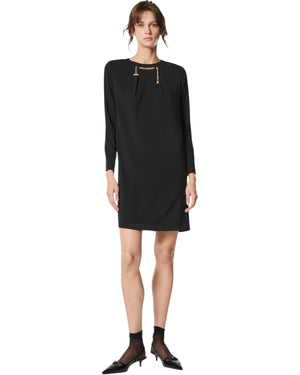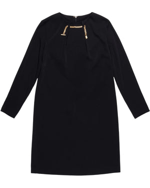 Κοντό φόρεμα με μακριά μανίκια και στρογγυλή λαιμόκοψη, διακοσμημένο με μια κομψή χρυσή αλυσίδα που τονίζει το απλό σχέδιο. Ένα εκλεπτυσμένο και μοντέρνο κομμάτι, ιδανικό για μια casual-chic εμφάνιση που δεν θα περάσει απαρατήρητη.