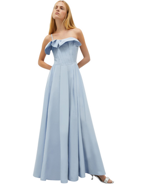 Το structured μπούστο με ασύμμετρο ντεκολτέ και στήριξη από εσωτερικές μπανέλες εξασφαλίζει τέλεια εφαρμογή, ενώ η φαρδιά, μακριά vintage-inspired φούστα χαρίζει θεατρικότητα και φινέτσα σε κάθε βήμα. Το φόρεμα κλείνει στο πλάι με φερμουάρ για άψογη εφαρμογή.