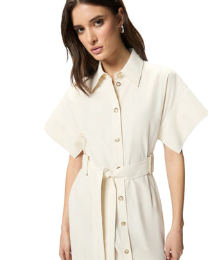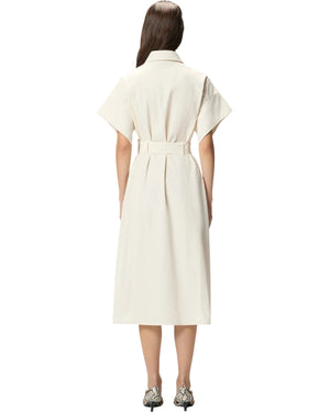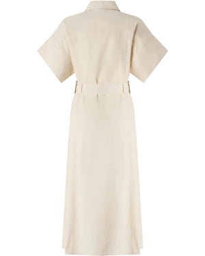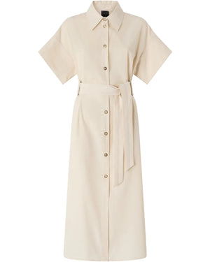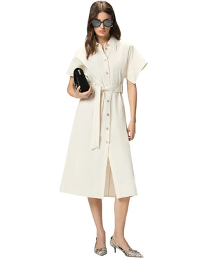 Μίντι σεμιζιέ φόρεμα με γιακά σε στυλ πουκάμισου, φαρδιά κοντά μανίκια, βολικές πλευρικές τσέπες και κάτω μέρος σε ίσια και ελαφρώς εβαζέ γραμμή στο τελείωμα. Διαθέτει κλείσιμο μπροστά με κομψά κουμπιά και ασορτί, αφαιρούμενη ζώνη στη μέση που δένεται. Είναι κατασκευασμένο από ένα ιδιαίτερο, λεπτό βαμβακερό ύφασμα με χυτή αλλά πυκνή υφή και θα συνοδεύσει τα καθημερινά σας looks με μοντέρνο χαρακτήρα. Το φόρεμα είναι φοδραρισμένο για ακόμα περισσότερη άνεση.