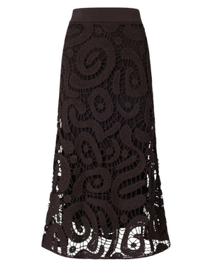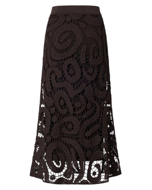 Φούστα με μίντι μήκος, εβαζέ γραμμή στο κάτω μέρος και ελαστική μέση, που χαρακτηρίζεται από μια κομψή κροσέ πλέξη με ιδιαίτερο γεωμετρικό σχέδιο που, χάρη στην φόδρα εσωτερικά, χαρίζει δυναμικό χαρακτήρα στο σχέδιο και δημιουργεί μια ημιδιάφανη όψη.