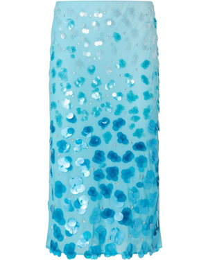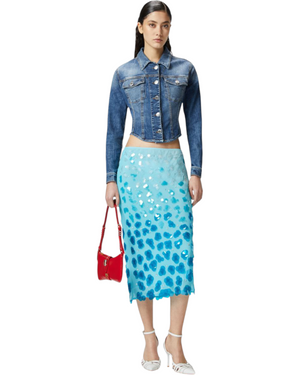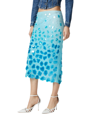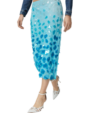 Φούστα σε ίσια γραμμή, σε στενή γραμμή, μέχρι τη γάμπα, με εφέ ντεγκραντέ σε όλο το μήκος, και μεγάλες πούλιες που δημιουργούν ένα μοτίβο με κοσμήματα σε χρώμα που ταιριάζει με τον τόνο της φούστας. Αυτή η φούστα είναι εύκολη στη χρήση και στον συνδυασμό: η εφαρμογή slip-on με λεπτή ελαστική ζώνη την καθιστά ένα πολυχρηστικό κομμάτι που μπορείτε να συνδυάσετε με ένα τζιν μπουφάν ή να την αναβαθμίσετε με ένα πουκάμισο για μια ξεχωριστή βραδιά.