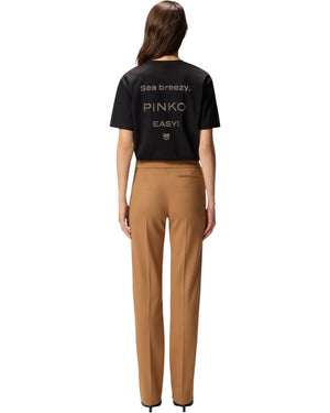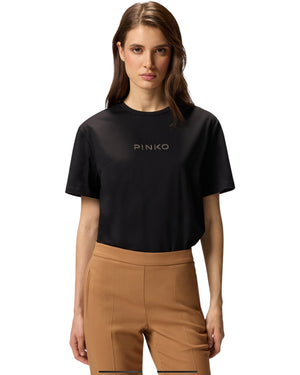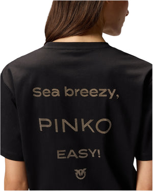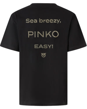 Μπλούζα από καθαρό βαμβάκι ζέρσεϊ με στρογγυλή λαιμόκοψη και κοντά μανίκια. Το κομμάτι διαθέτει λαμπερά στρας που καλύπτουν τόσο το λογότυπο PINKO στο μπροστινό μέρος όσο και την επιγραφή στο πίσω μέρος με το σύνθημα "See breezy, PINKO easy" και το απαραίτητο λογότυπο Love Birds. Αυτή η μπλούζα θα συνδυαστεί άψογα με το αγαπημένο σας παντελόνι, απογειώνοντας την εμφάνισή σας με έναν απλό, κομψό και πρωτότυπο τρόπο.