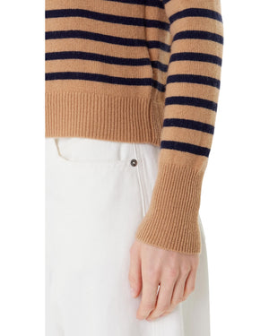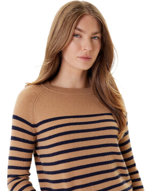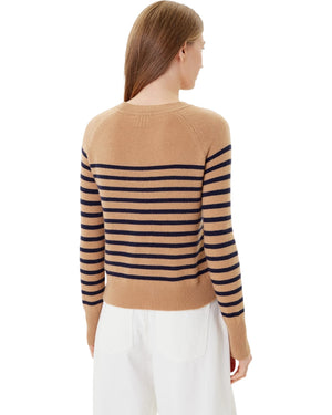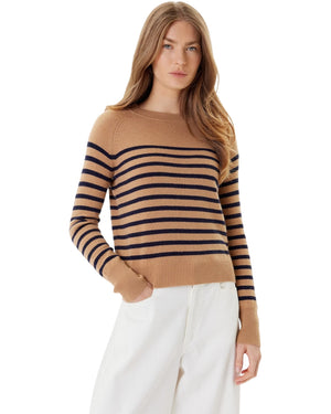 Υποδεχτείτε τη νέα σεζόν με την απαλή πινελιά αυτού του πουλόβερ από μαλλί-κασμίρι. Η ίσια γραμμή και τα ραγκλάν μανίκια ορίζουν μια μοντέρνα εμφάνιση, ενώ το ριγέ μοτίβο με ναυτικό προσθέτει αυτή τη διαχρονική πινελιά που αγαπάτε τόσο πολύ.