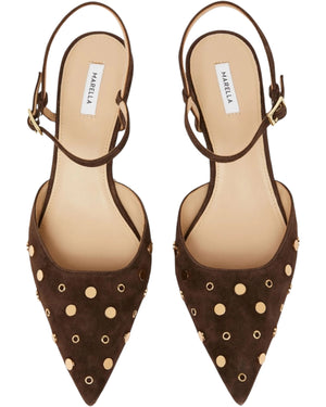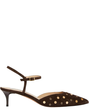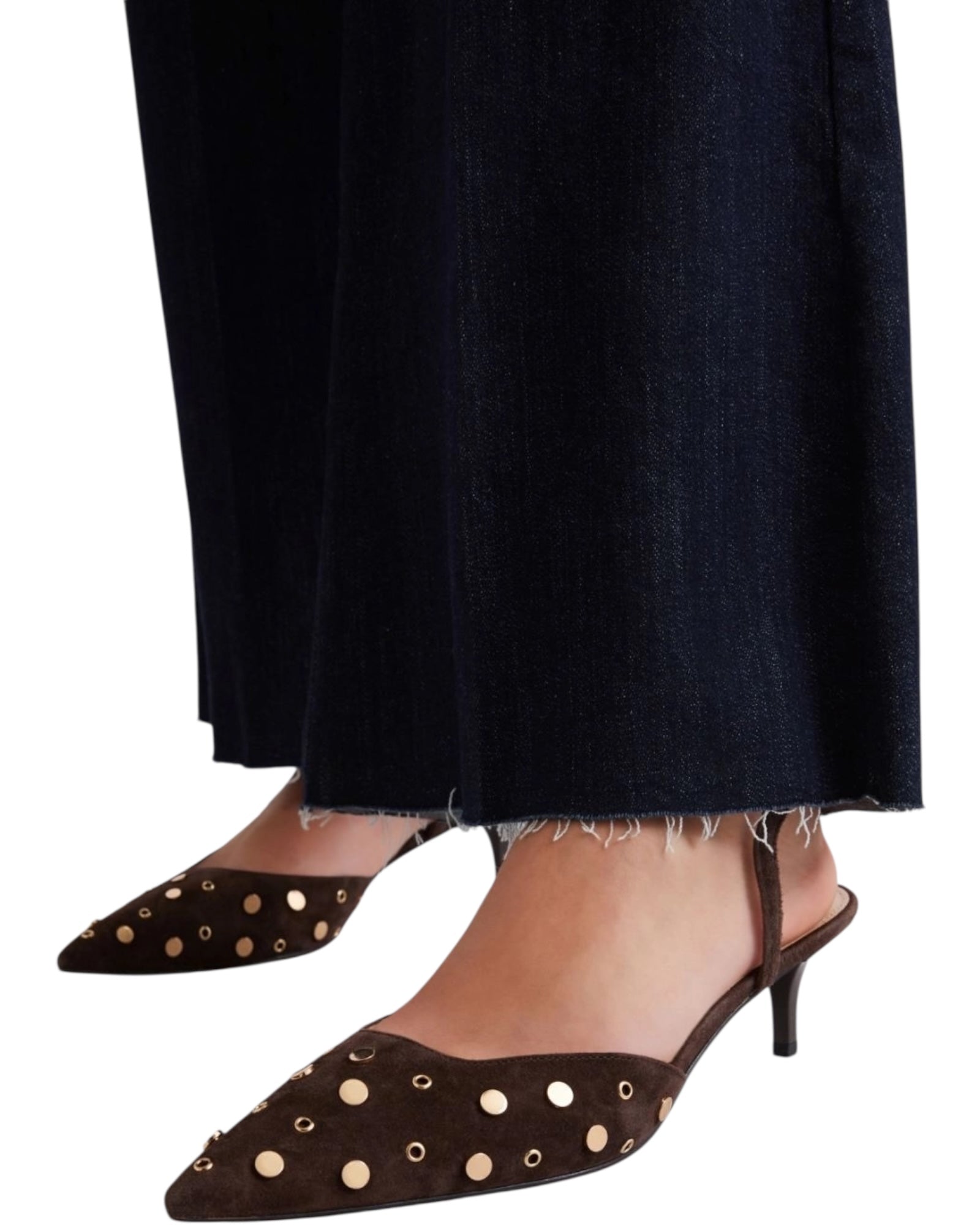 Χρυσά καρφιά κοσμούν το πιο μοντέρνο σχήμα αυτή τη στιγμή: το πιο δημοφιλές μοντέλο slingback διαθέτει λεπτό τακούνι και τον τέλειο ροκ σικ τόνο.